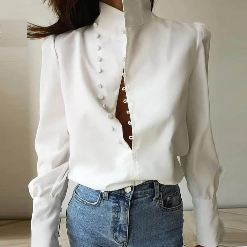 Elegant New Puff shoulder blouse shirts Office Lady Autumn Metal Buttoned Detail Blouses women Pineapple print long sleeve tops,Office Lady solid Button Pockets blouse shirts women casual trun down collar Autumn tops women New Adjustable long sleeve shirts, Office Lady solid Button Pockets blouse shirts women casual trun down collar Autumn tops women New Adjustable long sleeve shirts