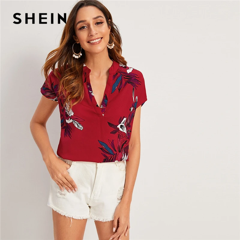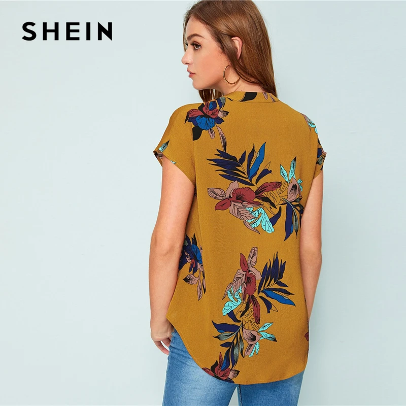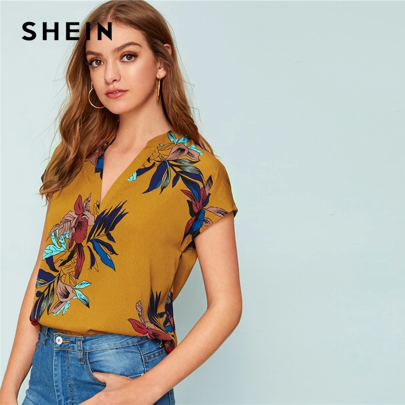 astounding SHEIN Yellow V-neck Floral Print Notched Blouse Womens Tops and Blouses Summer Casual Short Sleeve
