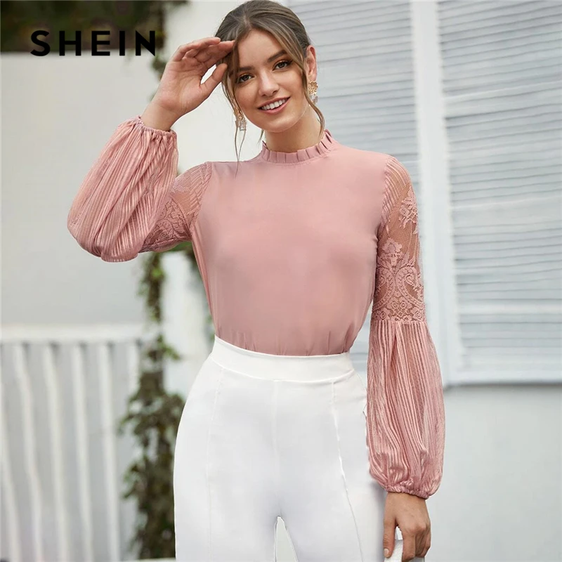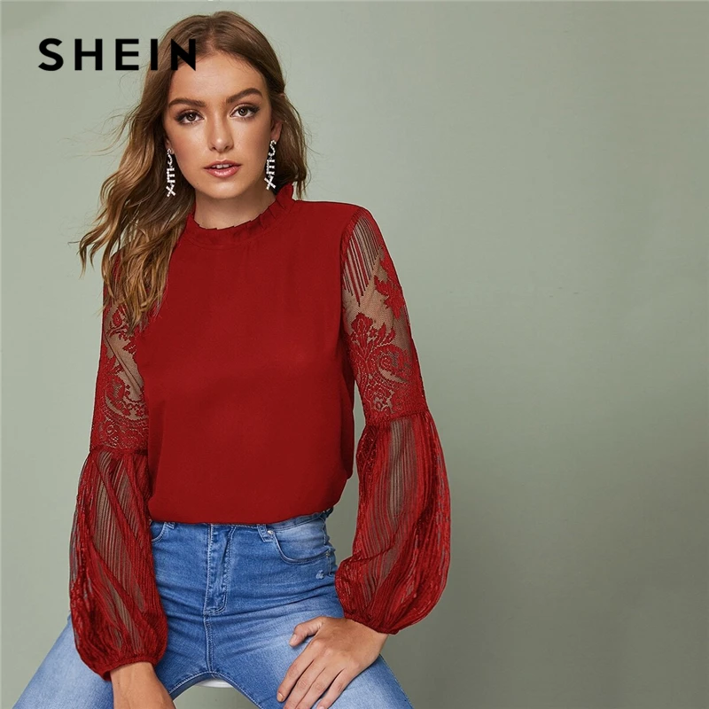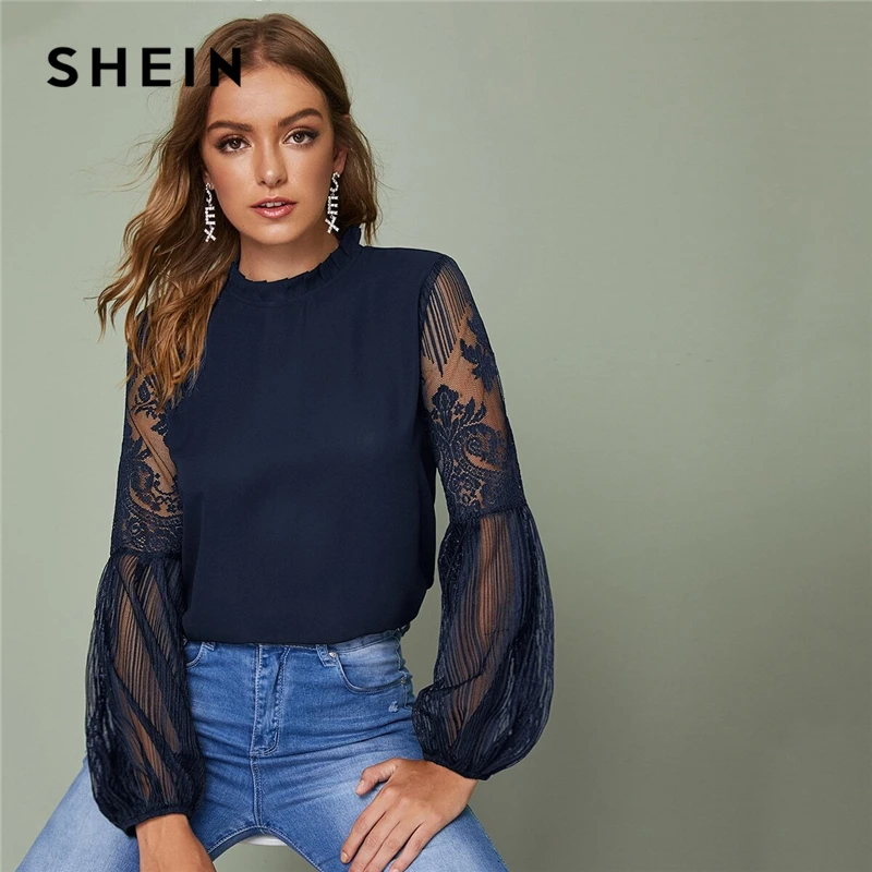 astounding SHEIN Frilled Neck Lace Sheer Elegant Blouse Top Women 2019 Spring Autumn Stand Collar Bishop Sleev